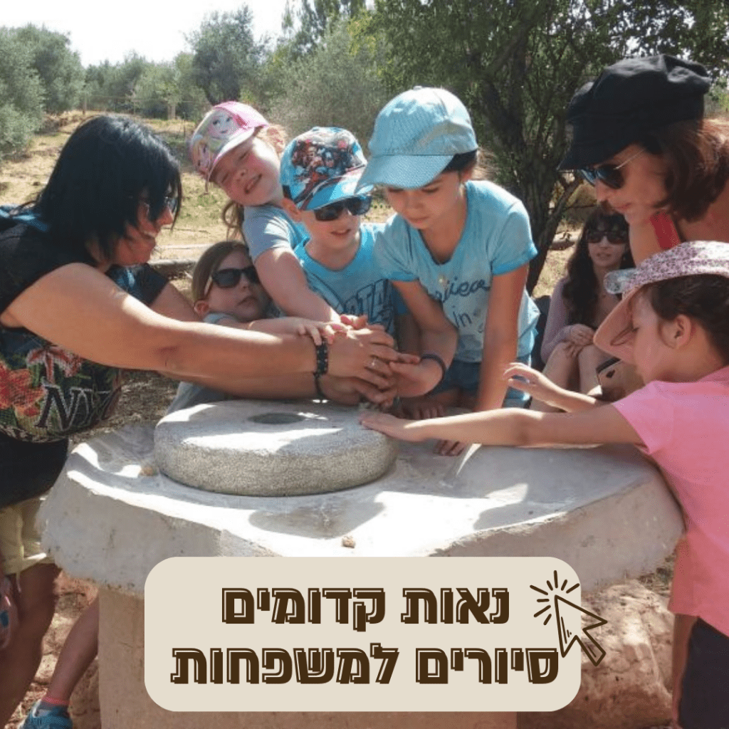 במהלך הסיור נטחן זרעי חיטה לקמח, נכין שקיות ריח נעימות מהדסים ונעבור בין כרמי הזיתים והגפנים ונהנה מהשבילים הקסומים של נאות קדומים.